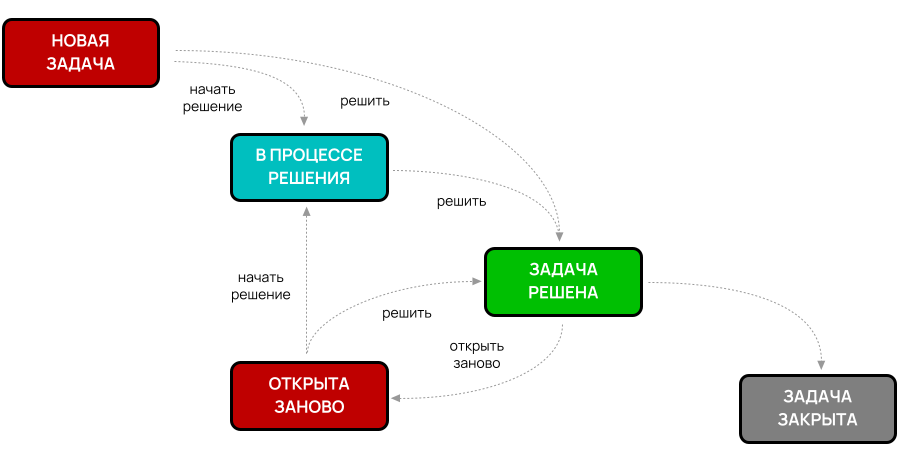 Типовая схема прохождения задачи от момента постановки до решения. Создание новой задачи и закрытие задачи осуществляются управляющим менеджером проекта. Весь процесс поддержки отслеживается в режиме реального времени. Если задача объёмная, то рабочей группой составляется прогноз по её решению.